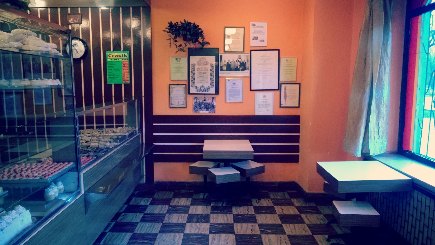 Do elementów wystroju zaliczają się także szklana witryna na cukiernicze wyroby oraz… uśmiechnięta pani ekspedientka. Obowiązkowo w białym fartuszku.