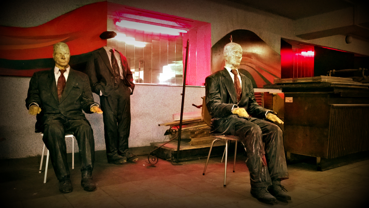 Z samej góry budynku zeszliśmy na sam dół, aż do tajemniczych podziemi, w których natrafiliśmy na pozostałości po wspomnianej „mordowni” oraz… kilka figur przedstawiających mężczyzn w czarnych garniturach.