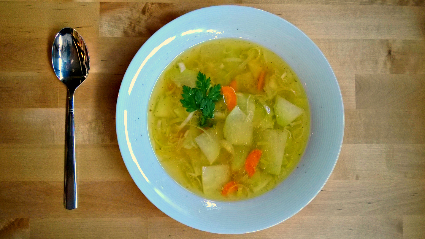 Wspomniana już polewka okazała się bardzo miłym zaskoczeniem. Było to ciekawe połączenie swojskiego rosołu z… japońską zupą ramen i kosztowało jedyne 5 złotych. W bulionie stadnie pływały cieniutko pokrojone plasterki kalarepy wraz z innymi dodatkami, które nadały jej specyficznego warzywnego posmaku i sprawiły, że porcja była wyjątkowo pożywna. Wyjątkowy smak to nie tylko zasługa kunsztu szefa kuchni, ale i świeżych składników od lokalnych dostawców. To właśnie współpracą z nimi chlubi się lokal.