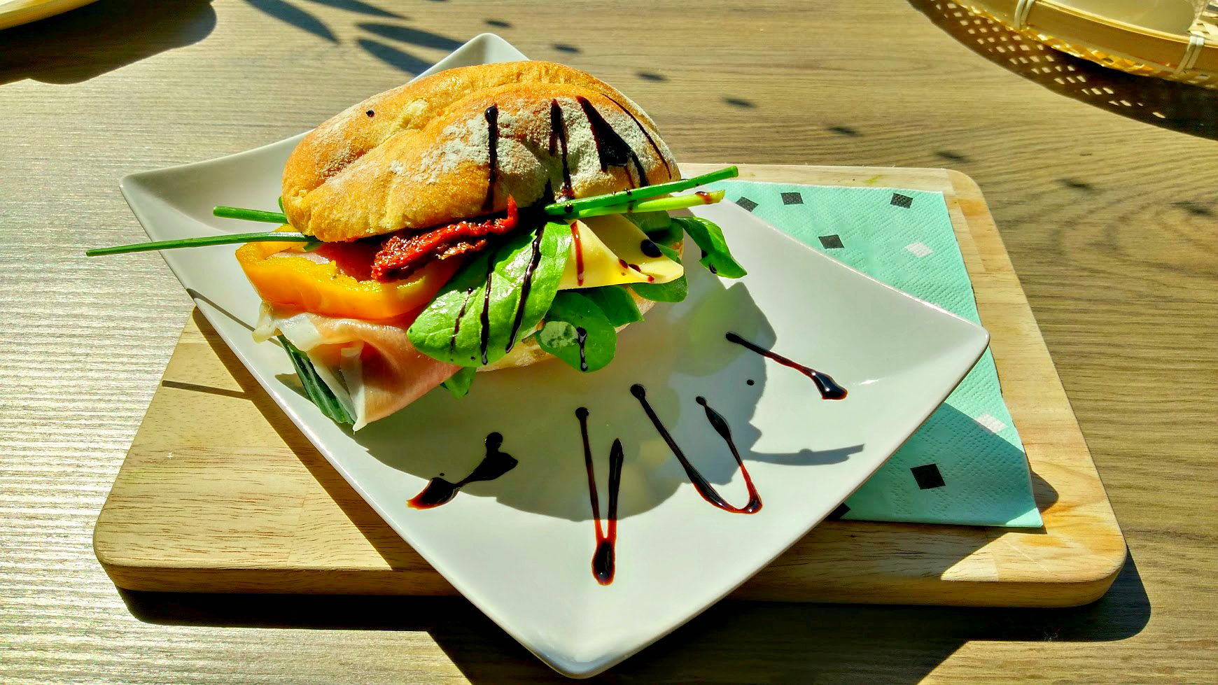 Chleb i KawaW naszej testowej bułce znaleźliśmy między innymi suszonego pomidora, rukolę, paprykę i włoską szynkę. Pochwalić musimy nie tylko całą tę kompozycję, ale także jakość samego pieczywa. Poza tym śniadaniowym smakołykiem spróbowaliśmy także chleba burgundzkiego (upieczonego z użyciem mąk żytniej, pszennej, sojowej i oleju rzepakowego) z sosem pesto. Wyborne!