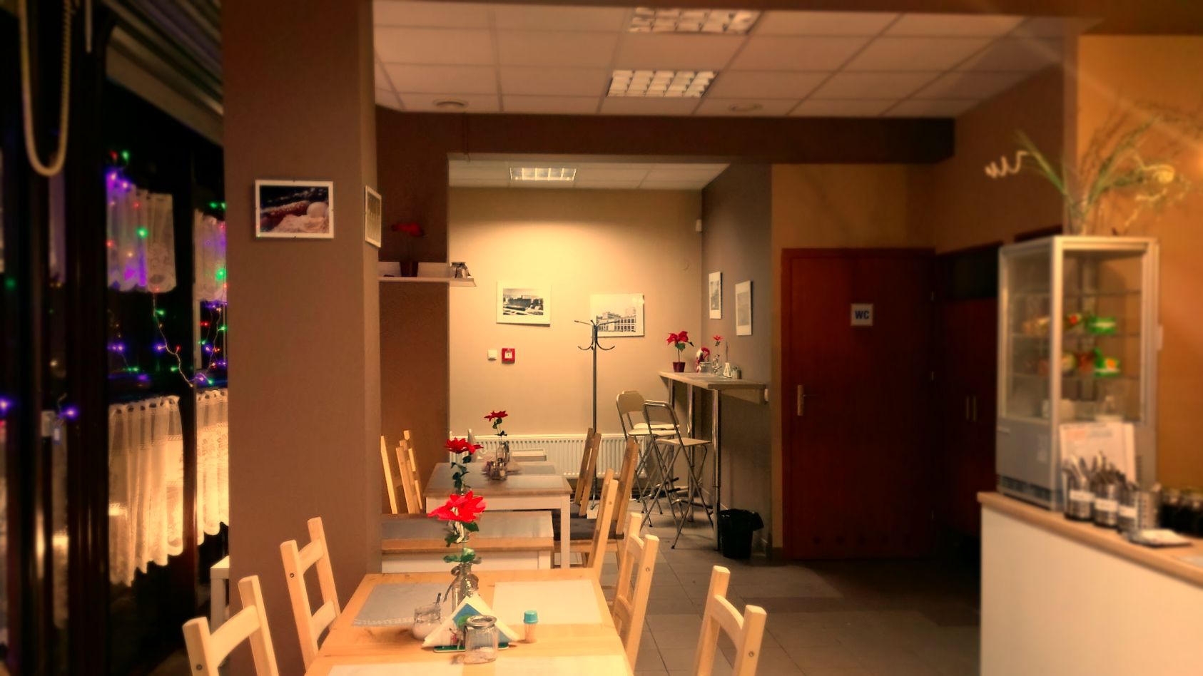 Po wejściu do środka jest jeszcze lepiej. Wnętrze Słoika jest ciepłe i przytulne. Zasłonki na oknach, małe lampiony wewnątrz, tu i tam kwiaty lub małe nowohuckie fotografie. Lubimy to. Jest jeszcze odrobinę za „sterylnie”, ale myślimy, że to tylko kwestia czasu. Czekamy na pojawienie się większej ilości klimatycznych gadżetów pokroju słoikowych lamp, które wiszą nad barem.