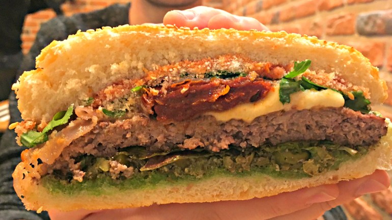 We wspomnianej już karcie znajdziemy 11 rodzajów burgerów oraz frytki belgijskie. Cieszy fakt, że każdą bułkę możemy zamówić w dwóch rozmiarach – na większy i mniejszy głód. My skusiliśmy na autorskie kompozycje o nazwach „Roman” i „Góral”. W pierwszym z nich poza obowiązkową średnio wysmażoną wołowiną i sałatą znalazły się także szynka parmeńska, suszony pomidor, rukola, mozzarella, oliwki i gwiazda całego zestawu, czyli pesto.